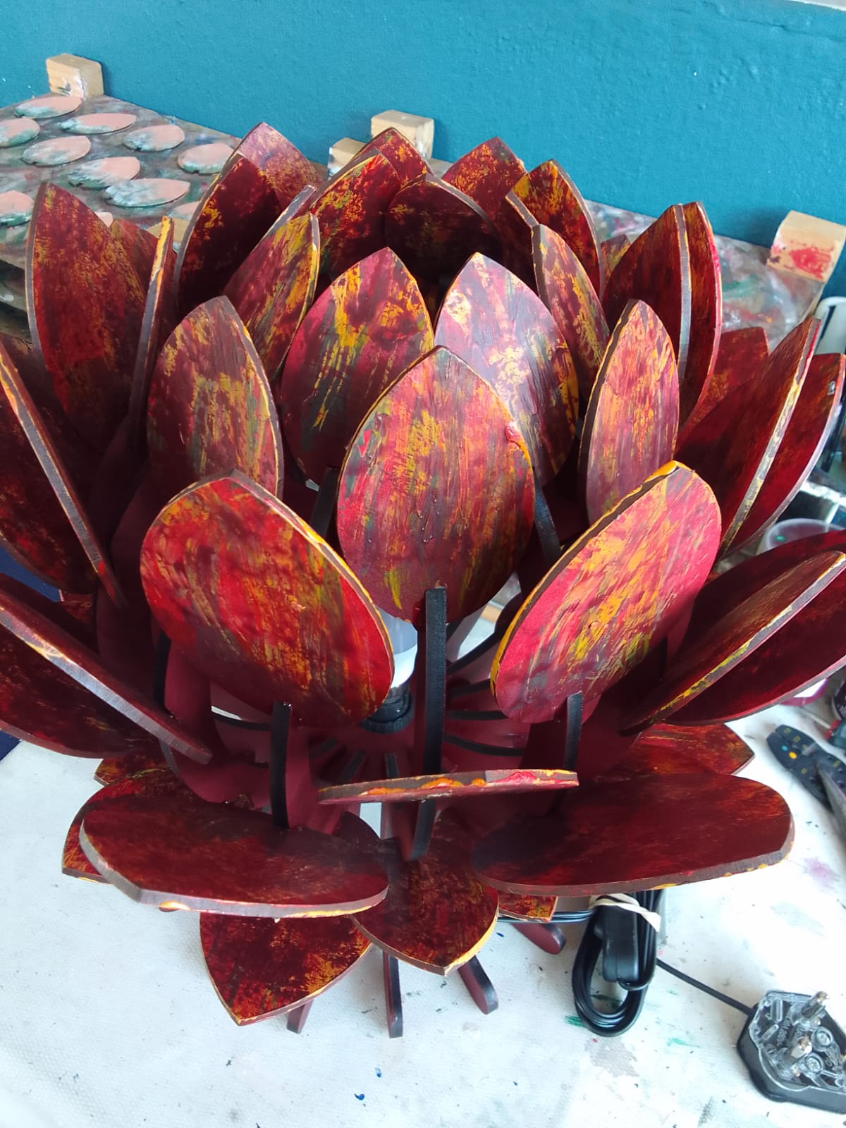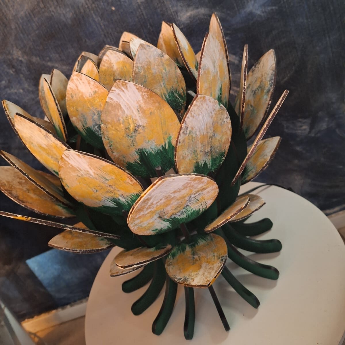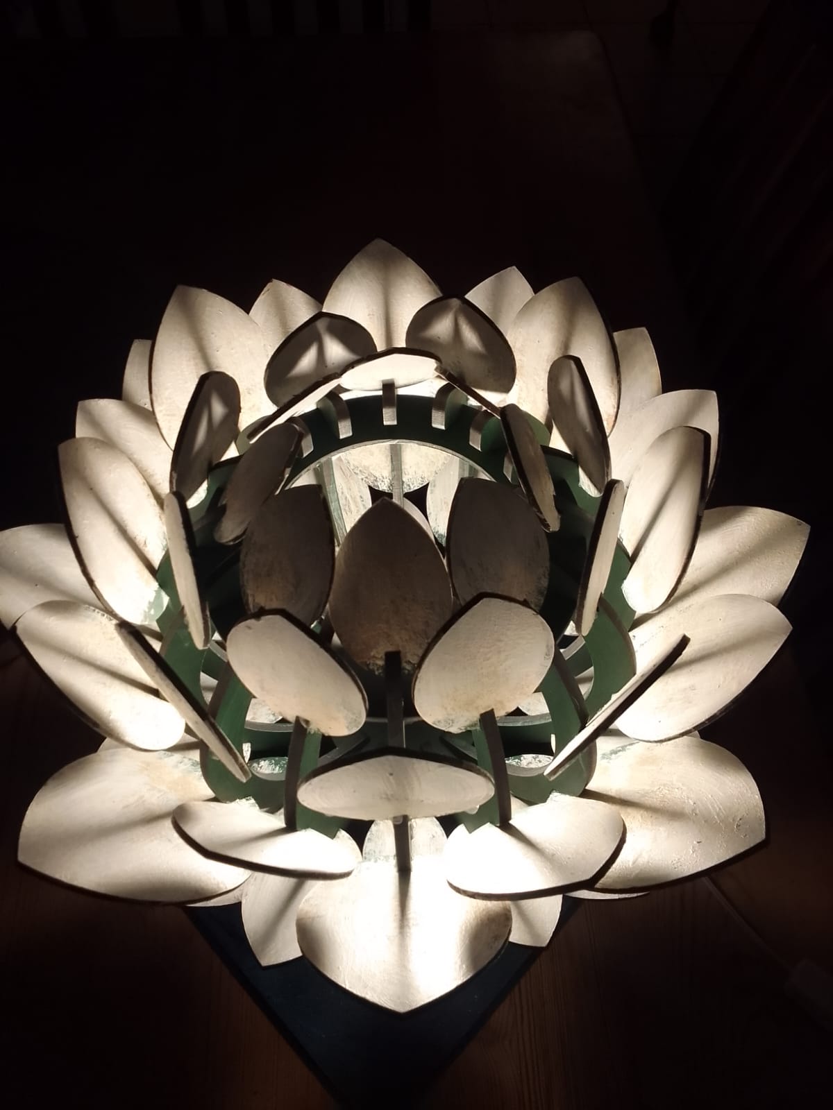 A stunning fusion of art and function that adds warmth and elegance to any space. Each petal is meticulously hand-painted in rich earthy tones, bringing out the natural beauty of the wood while creating a lifelike floral appearance. When lit, this unique lamp casts a soft, ambient glow that radiates through the layered petals, creating a captivating interplay of light and shadow. Perfect for enhancing a cozy corner or making a statement in your home decor, this lamp is both an artistic piece and a functional source of light. Embrace the charm of handcrafted decor with this one-of-a-kind, artisan-made wooden flower lamp.