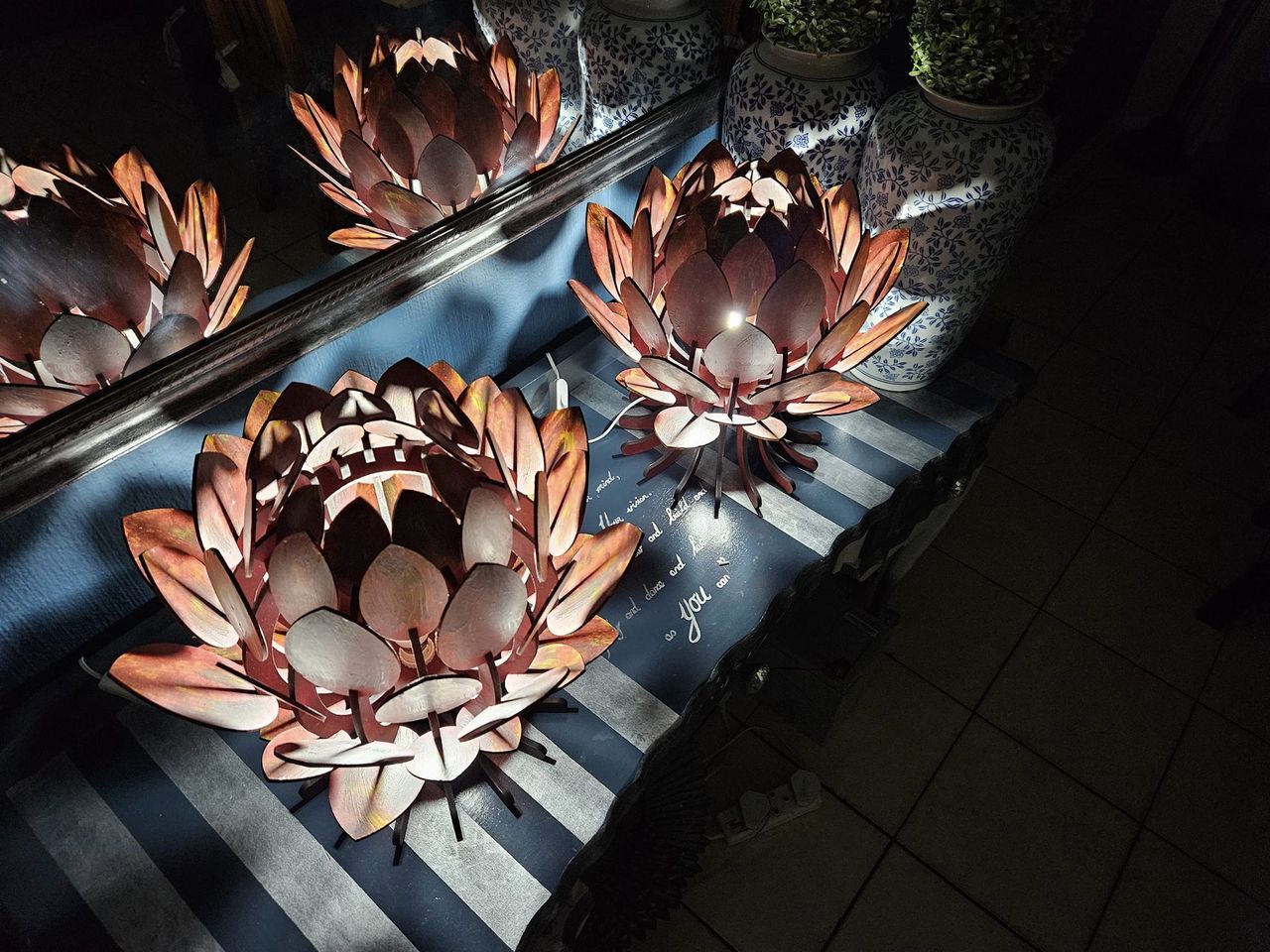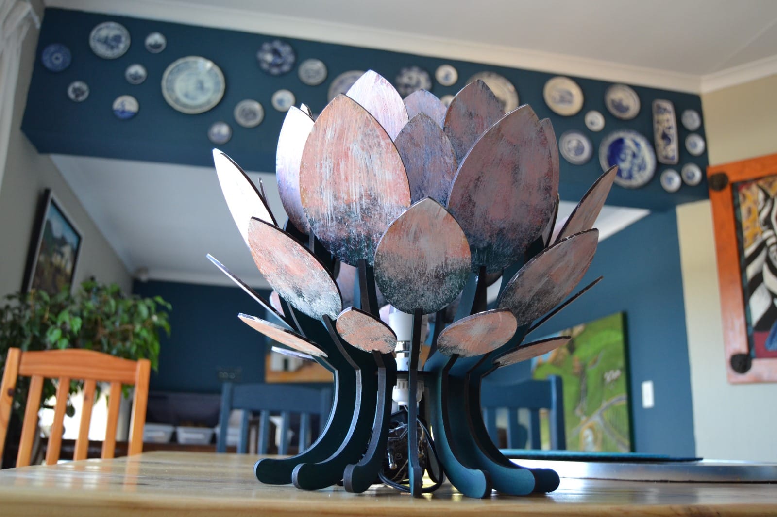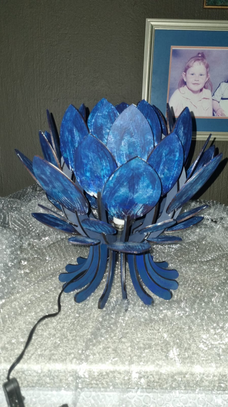 A stunning fusion of art and function that adds warmth and elegance to any space. Each petal is meticulously hand-painted in rich earthy tones, bringing out the natural beauty of the wood while creating a lifelike floral appearance. When lit, this unique lamp casts a soft, ambient glow that radiates through the layered petals, creating a captivating interplay of light and shadow. Perfect for enhancing a cozy corner or making a statement in your home decor, this lamp is both an artistic piece and a functional source of light. Embrace the charm of handcrafted decor with this one-of-a-kind, artisan-made wooden flower lamp.
